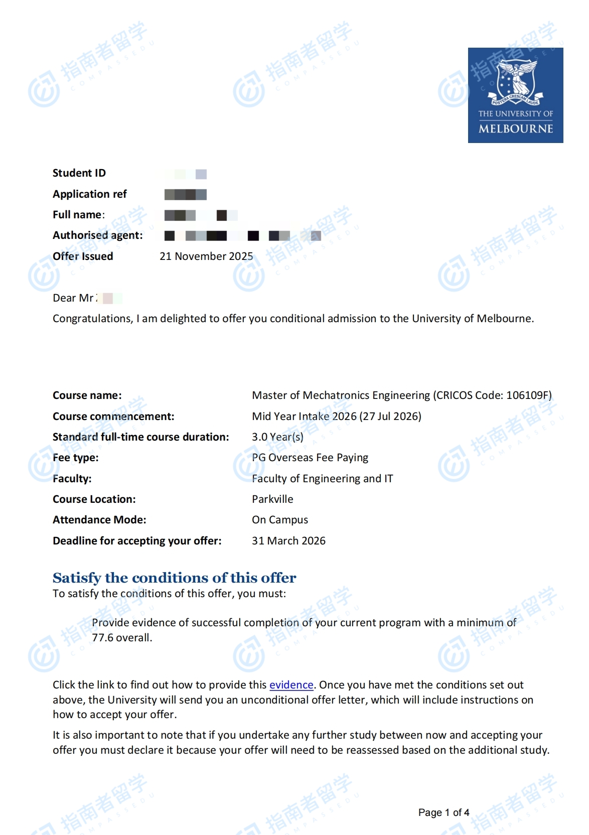 墨爾本大學(xué)機(jī)電一體化工程碩士研究生offer一枚