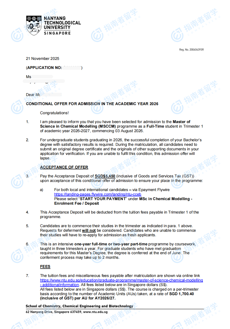 南洋理工大學(xué)化學(xué)建模理學(xué)碩士研究生offer一枚