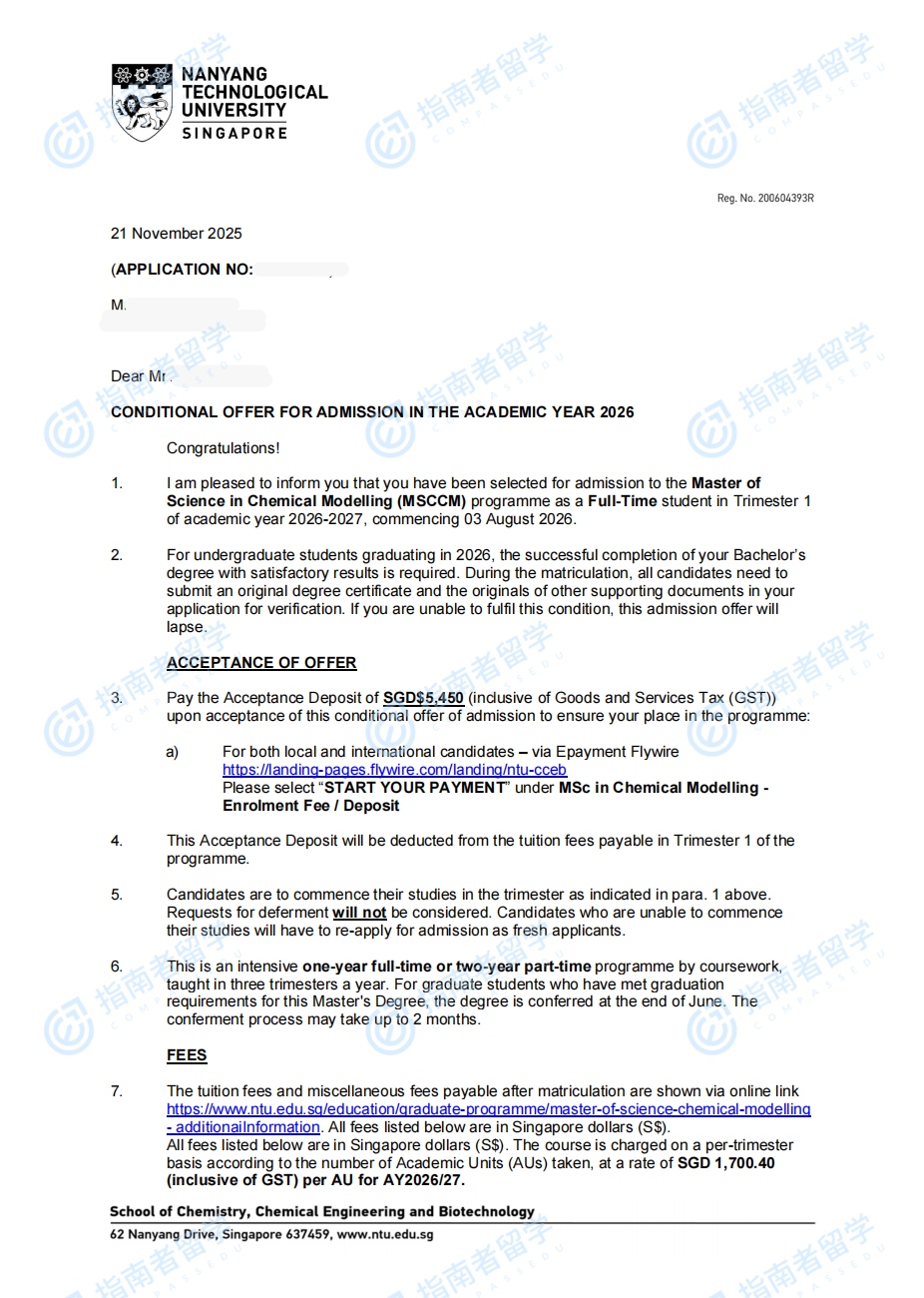 南洋理工大學(xué)化學(xué)建模理學(xué)碩士研究生offer一枚