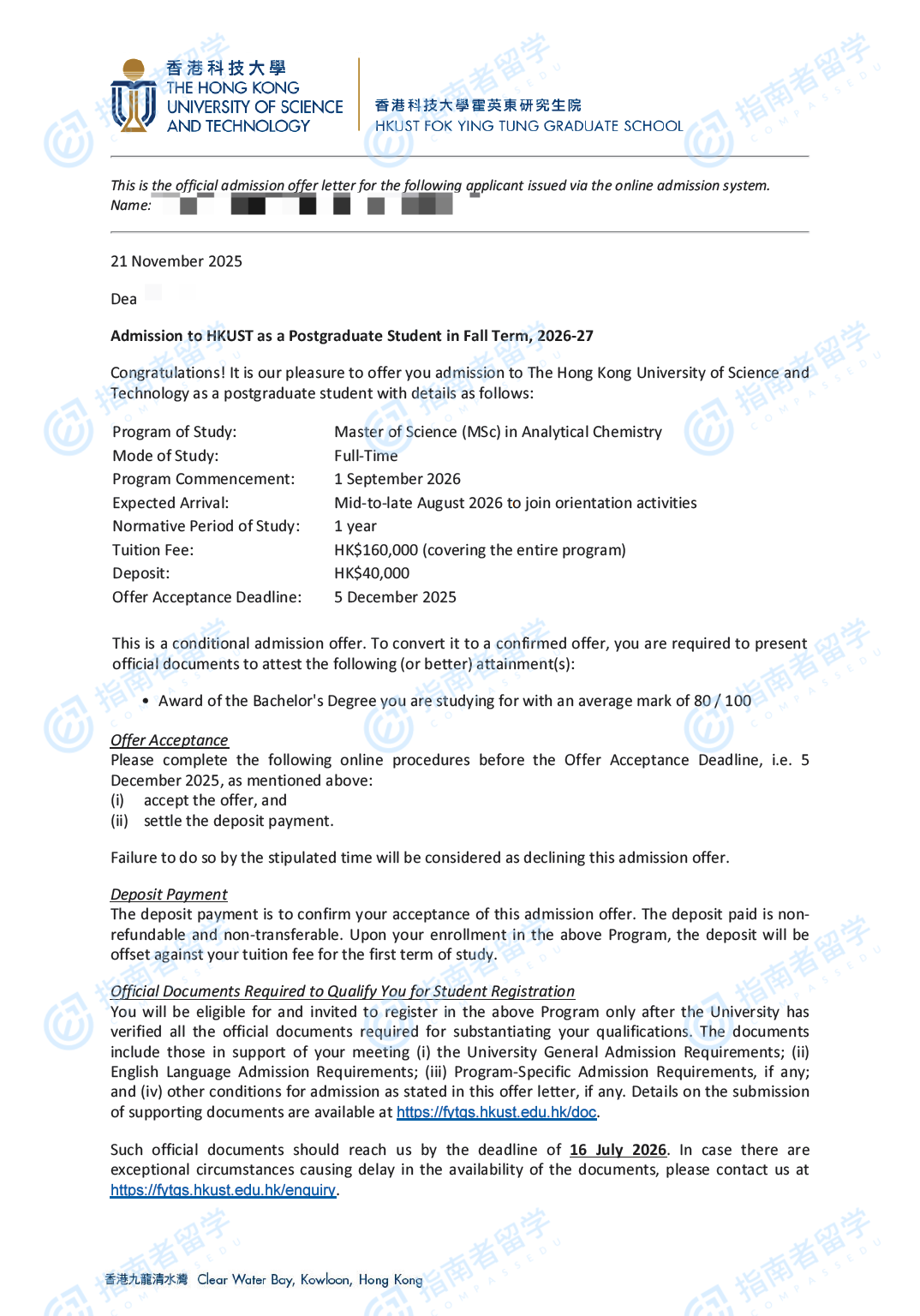 香港科技大學(xué)分析化學(xué)理學(xué)碩士研究生offer一枚