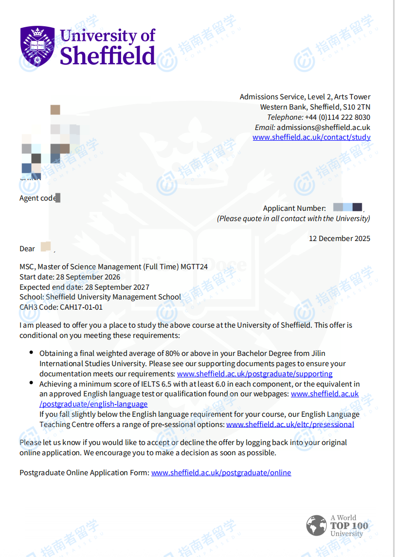 謝菲爾德大學管理學理學碩士研究生offer一枚