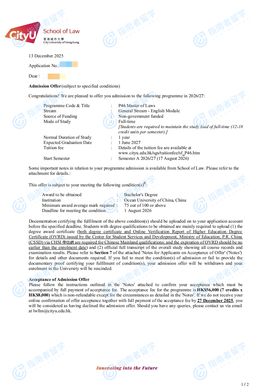香港城市大學(xué)法學(xué)碩士研究生offer一枚