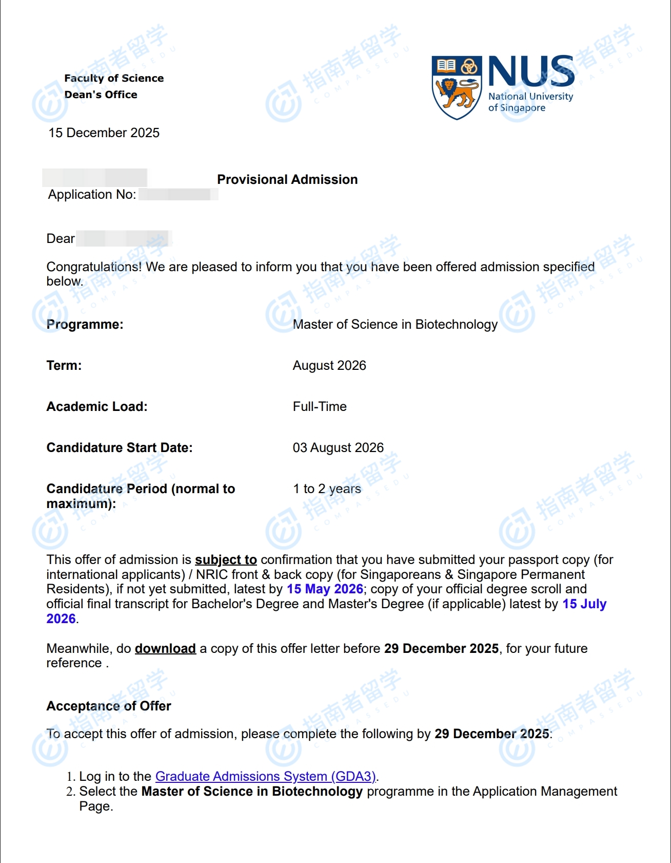 新加坡國立大學(xué)生物技術(shù)理學(xué)碩士研究生offer一枚