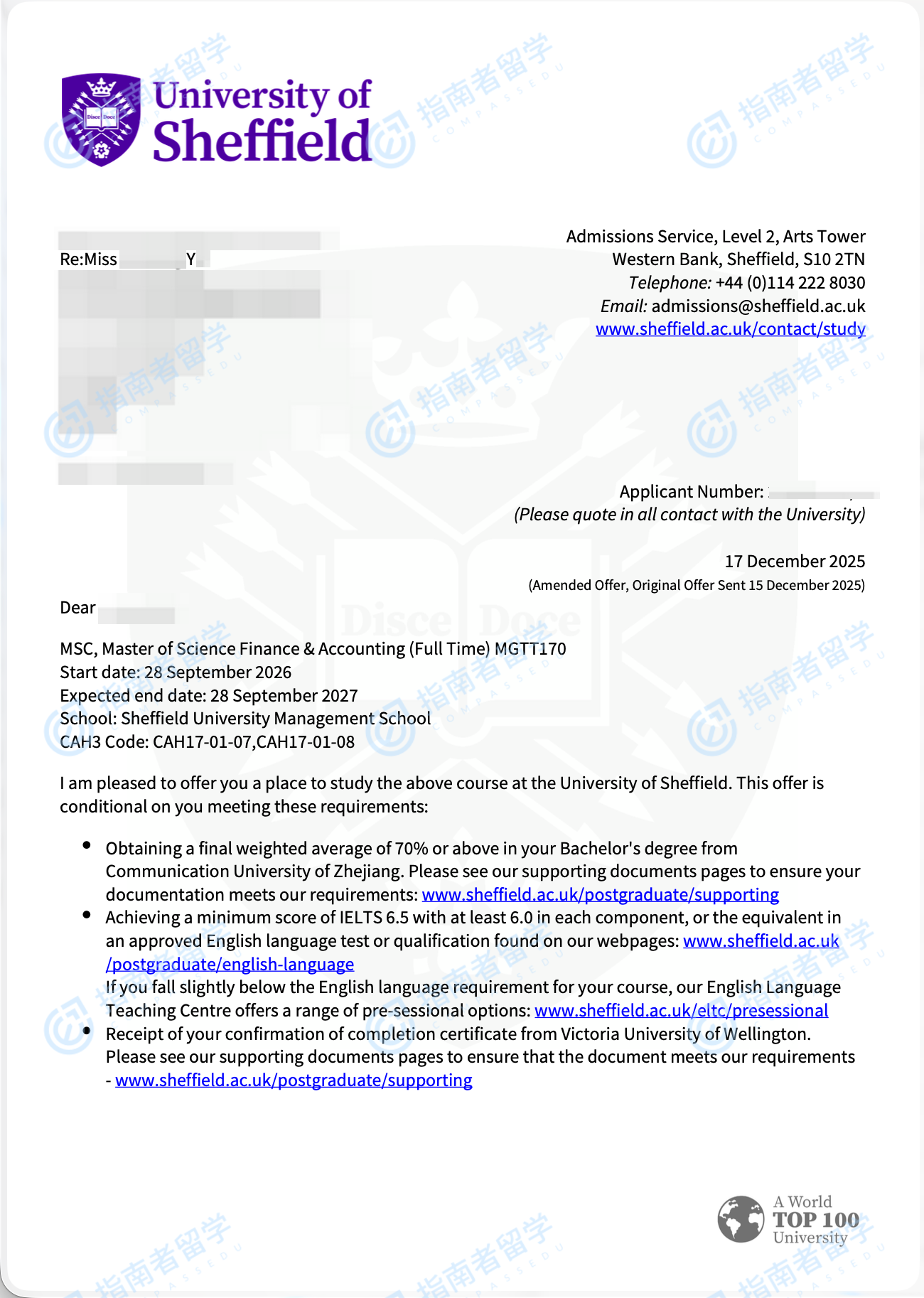 謝菲爾德大學(xué)金融與會(huì)計(jì)理學(xué)碩士研究生offer一枚