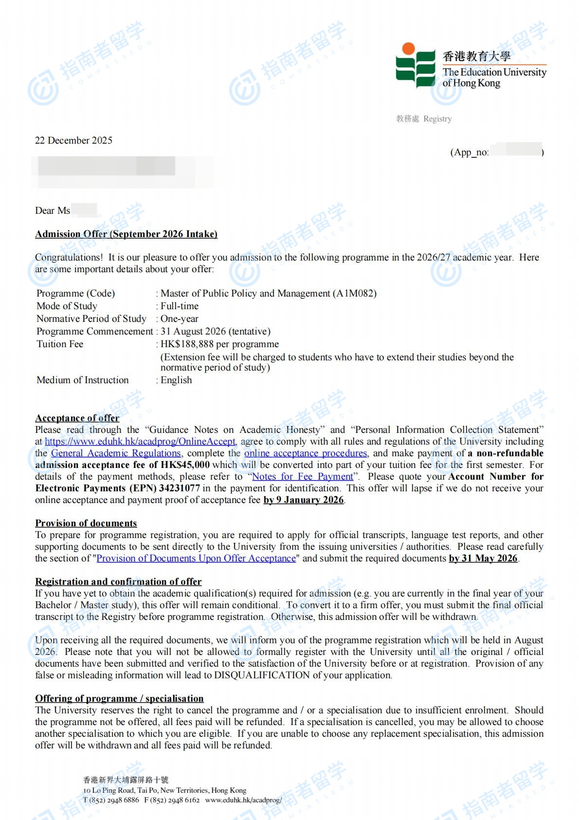 香港教育大學(xué)公共政策與管理碩士研究生offer一枚