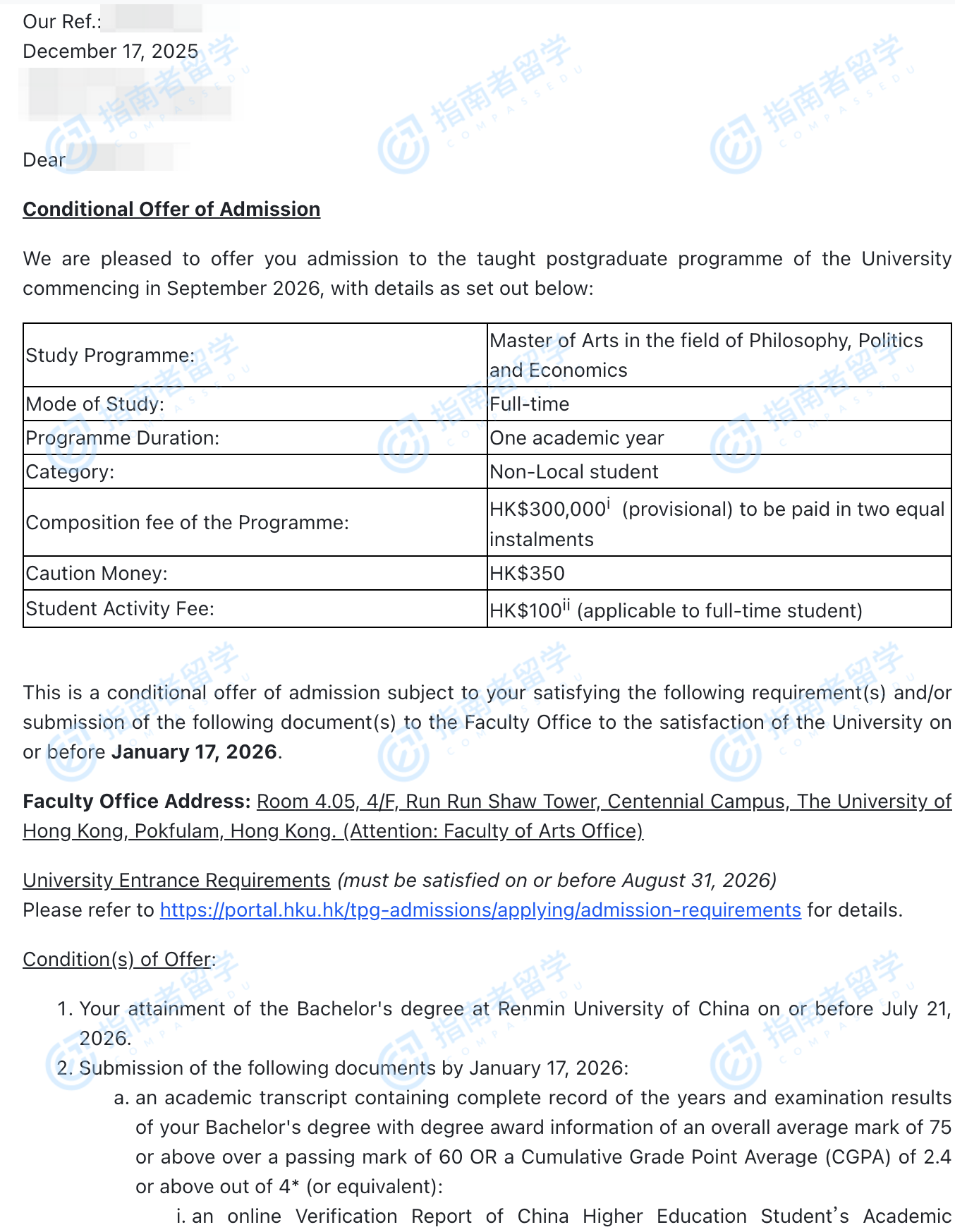 香港大學(xué)哲學(xué)、政治與經(jīng)濟學(xué)文學(xué)碩士研究生offer一枚
