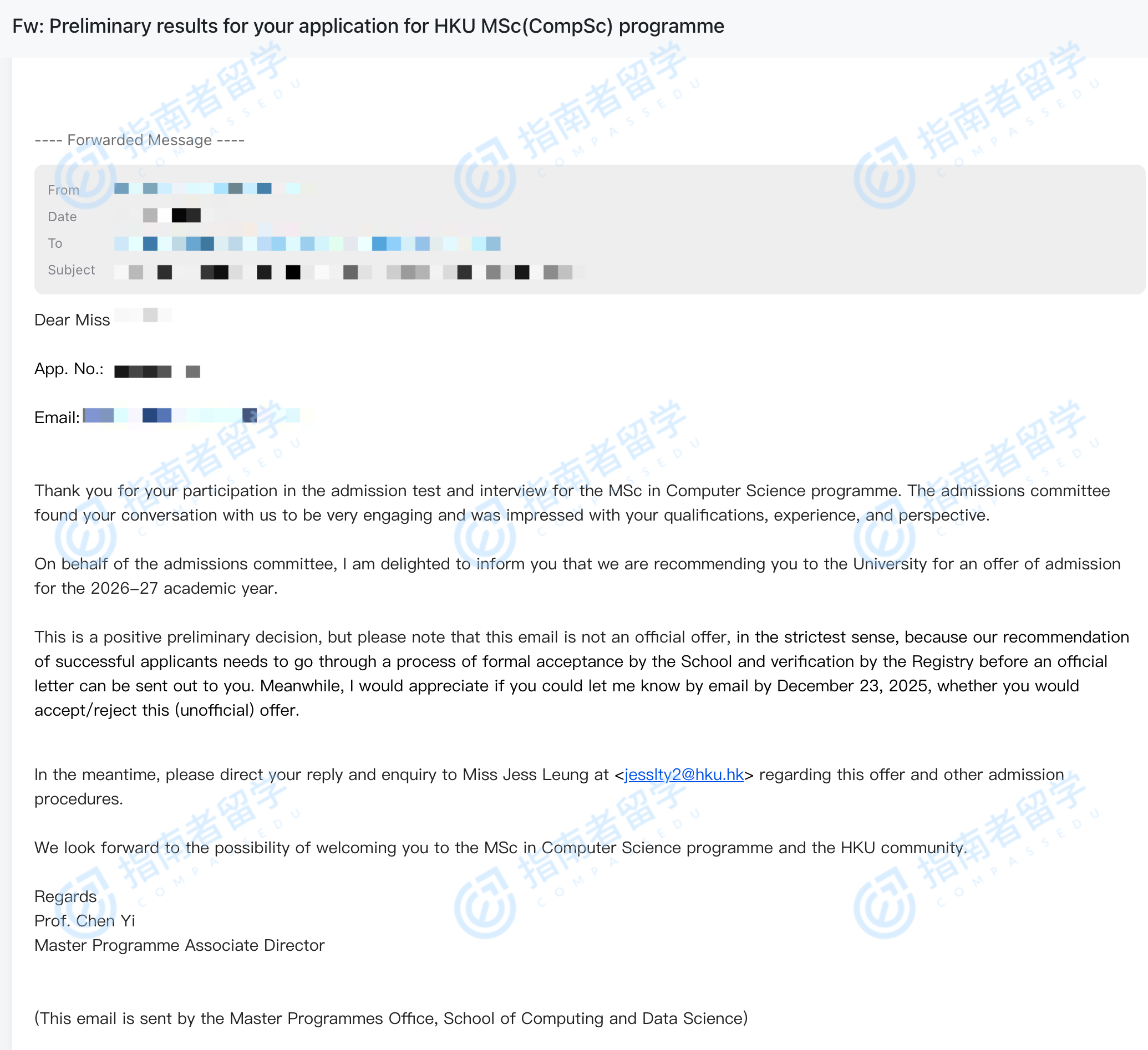 香港大學計算機科學理學碩士(常規(guī)方向)研究生offer一枚