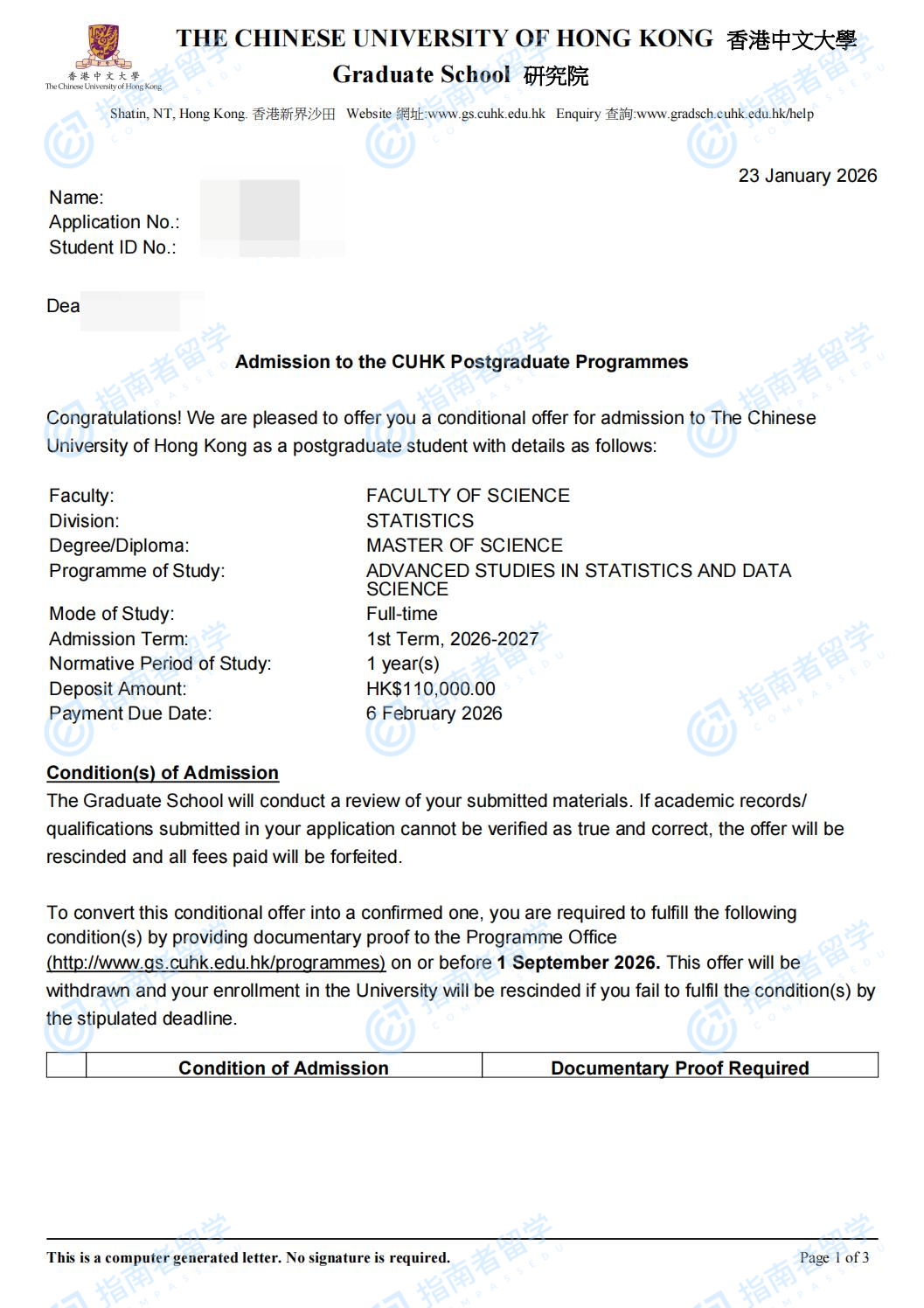 香港中文大學(xué)統(tǒng)計(jì)與數(shù)據(jù)科學(xué)高級(jí)研究理學(xué)碩士研究生offer一枚