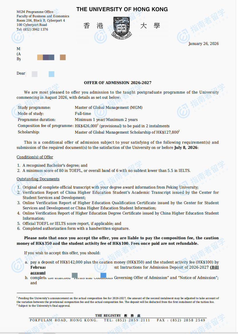香港大學(xué)環(huán)球管理學(xué)碩士研究生offer一枚