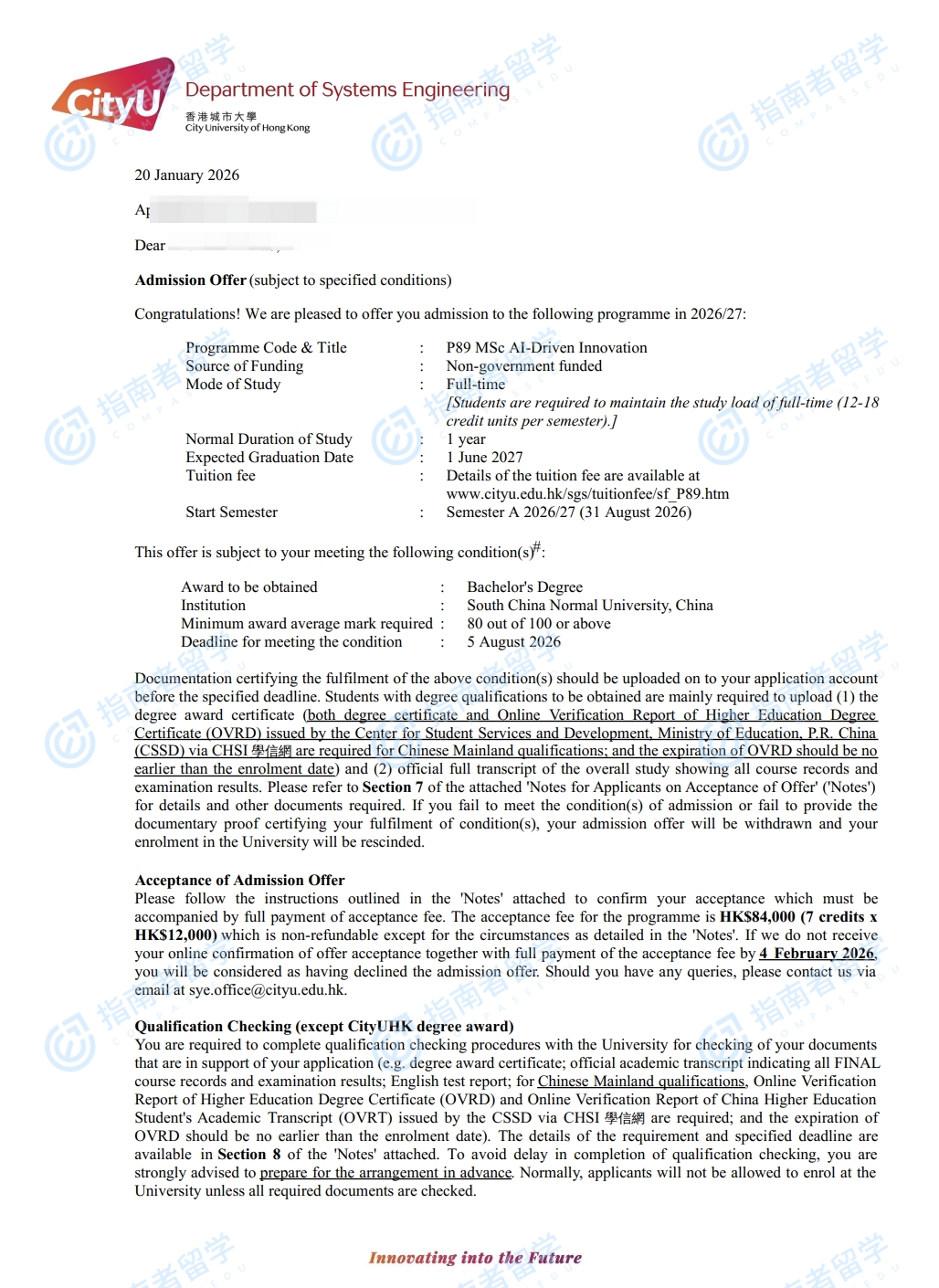 香港城市大學(xué)人工智能驅(qū)動創(chuàng)新理學(xué)碩士研究生offer一枚
