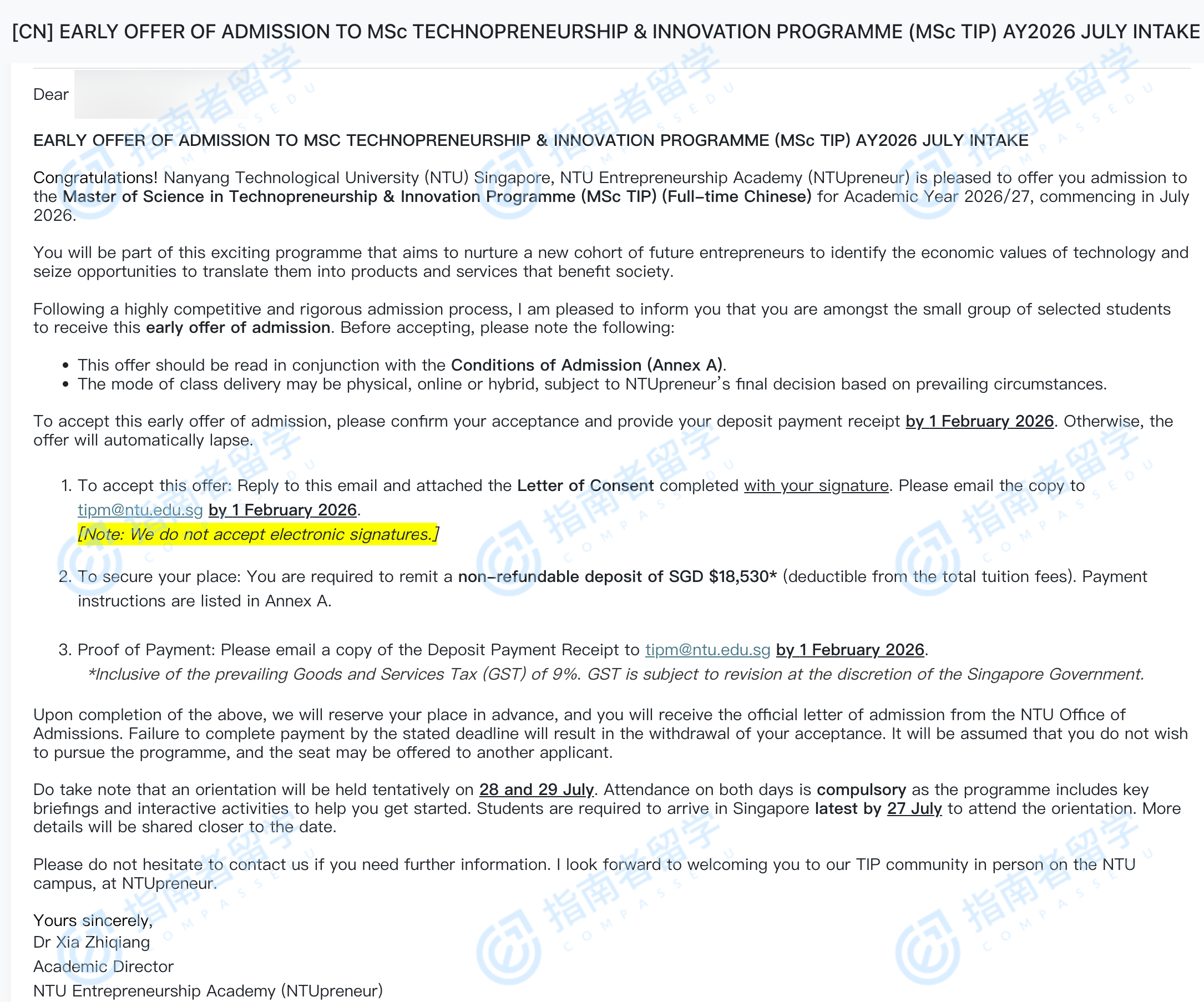 南洋理工大學科技創(chuàng)業(yè)與創(chuàng)新理學碩士(中文授課)研究生offer一枚