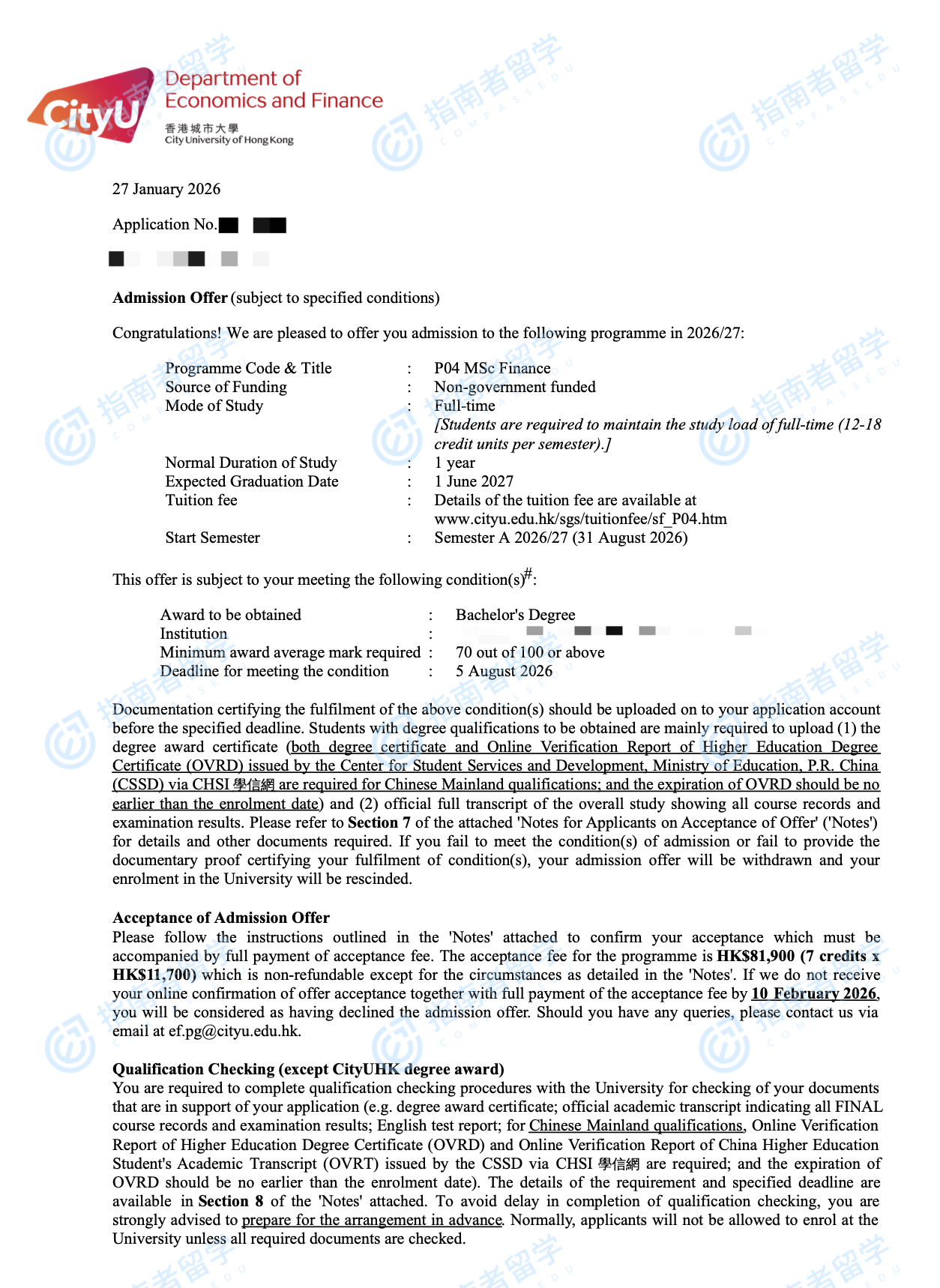 香港城市大學(xué)金融學(xué)理學(xué)碩士研究生offer一枚