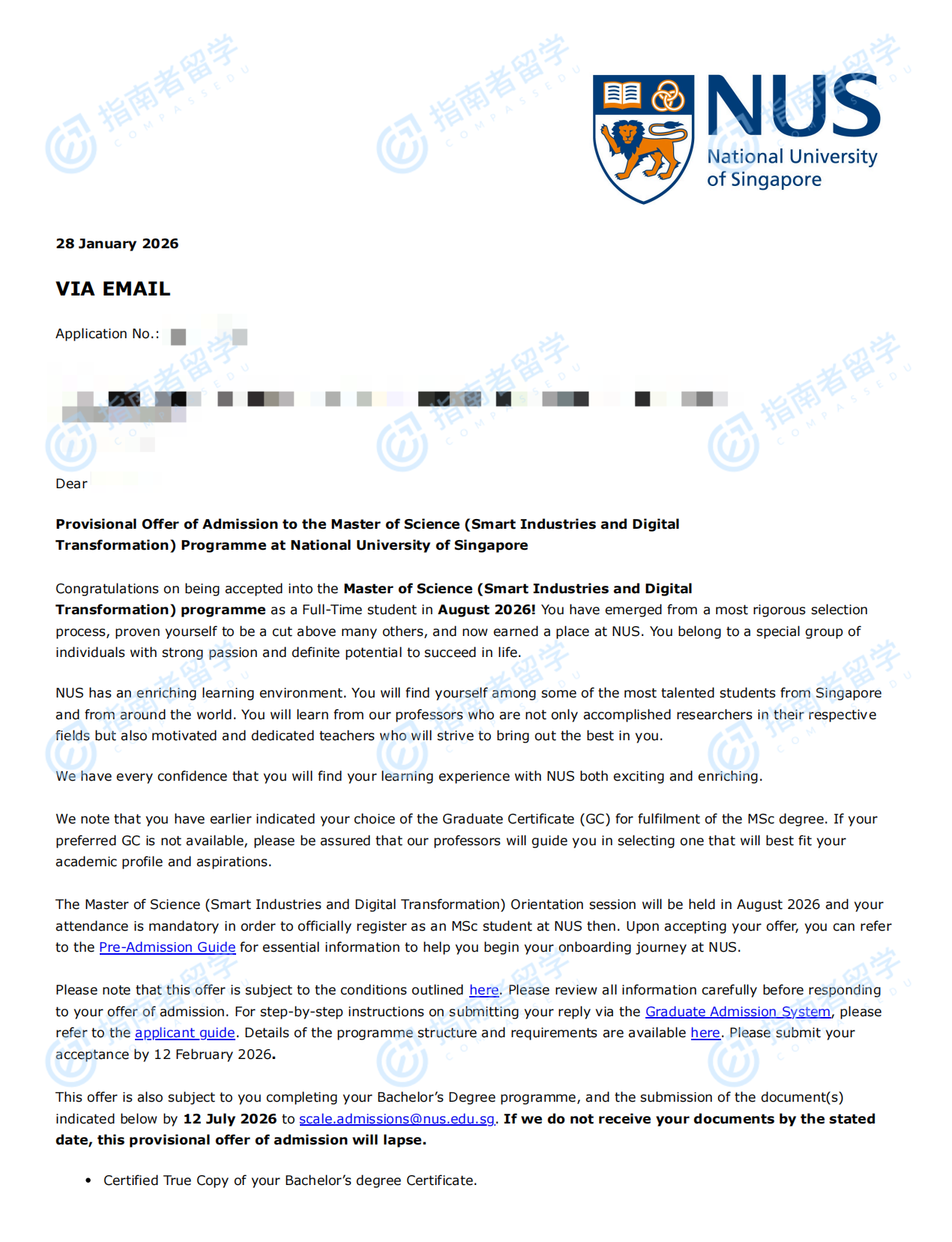 新加坡國立大學智能產(chǎn)業(yè)與數(shù)字化轉(zhuǎn)型理學碩士研究生offer一枚