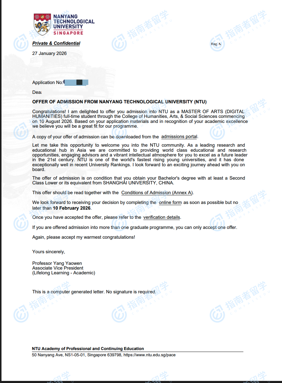 南洋理工大學(xué)數(shù)字人文文學(xué)碩士研究生offer一枚
