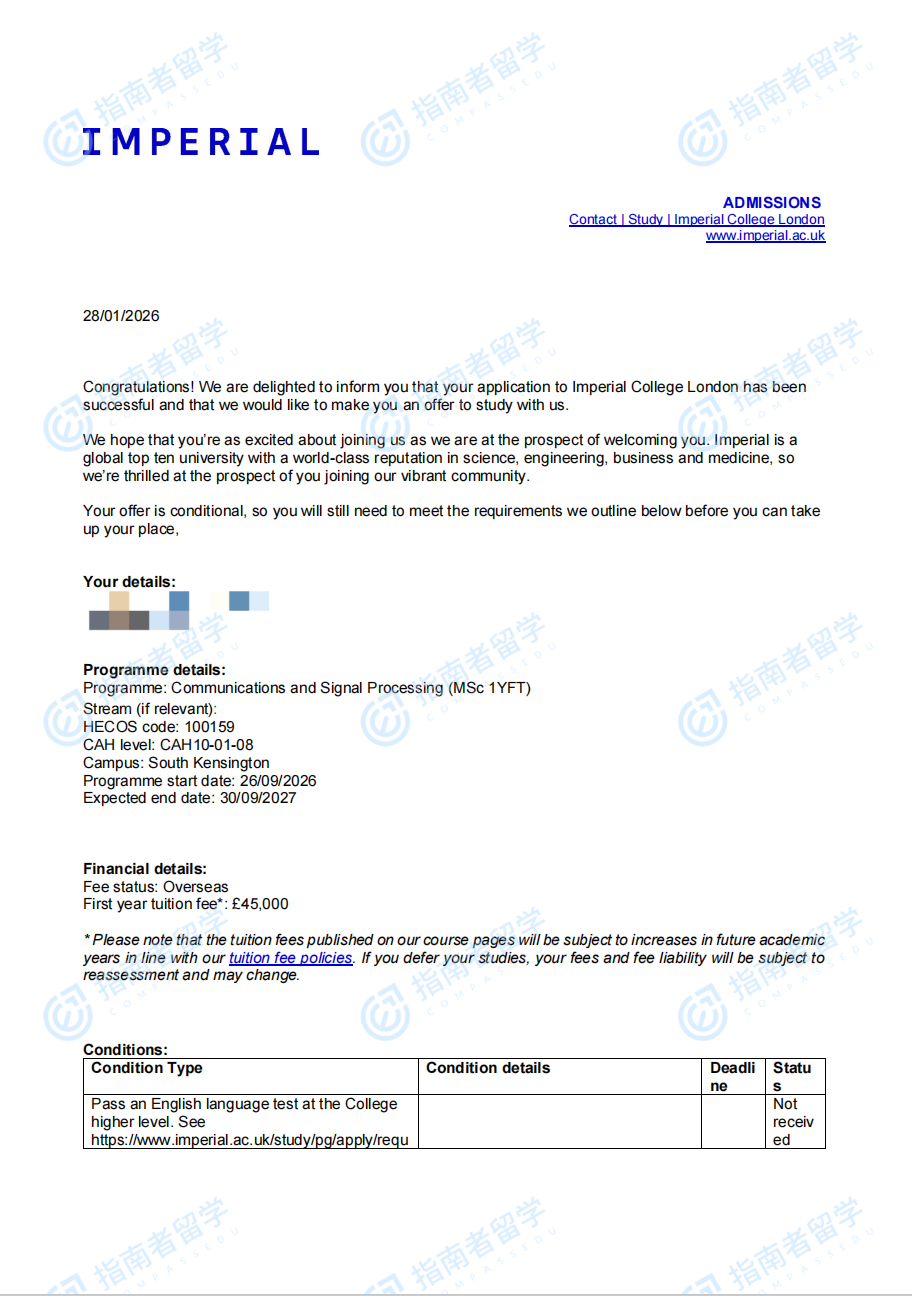 帝國理工學(xué)院通信與信號處理理學(xué)碩士研究生offer一枚