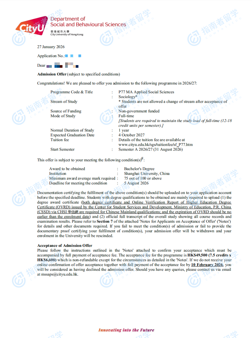 香港城市大學(xué)應(yīng)用社會科學(xué)文學(xué)碩士研究生offer一枚