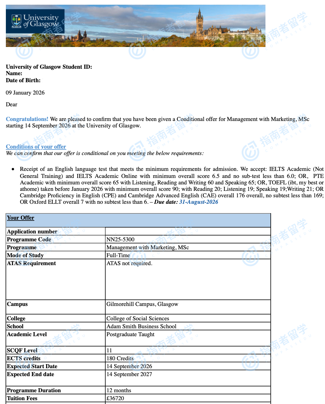 格拉斯哥大學(xué)管理學(xué)理學(xué)碩士(市場(chǎng)營(yíng)銷)研究生offer一枚