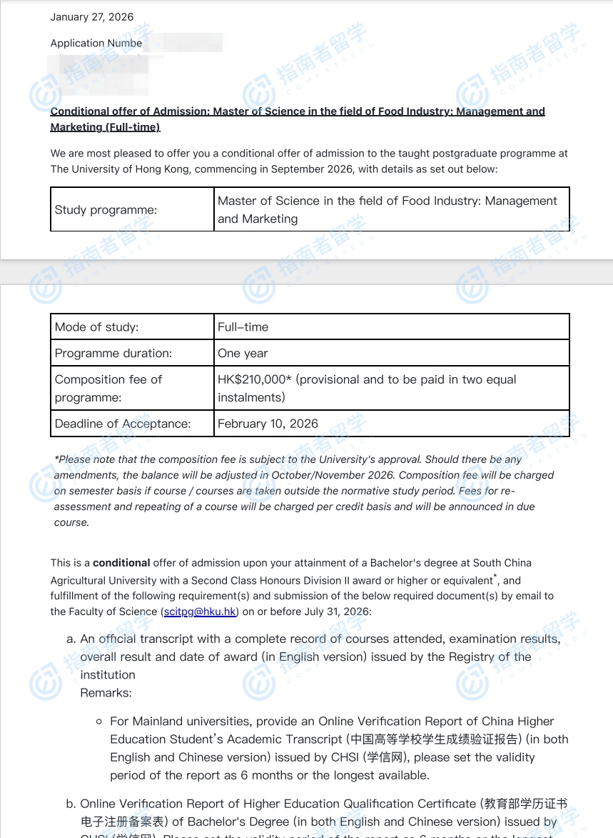 香港大學(xué)食品工業(yè):管理與市場營銷理學(xué)碩士研究生offer一枚