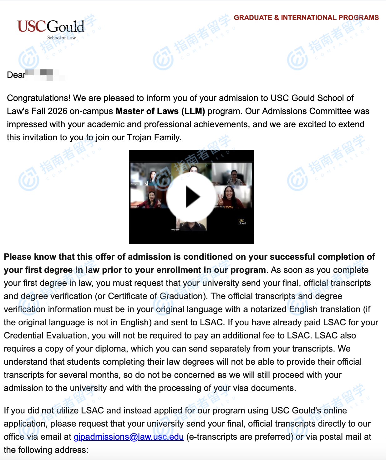 南加州大學(xué)法學(xué)碩士研究生offer一枚