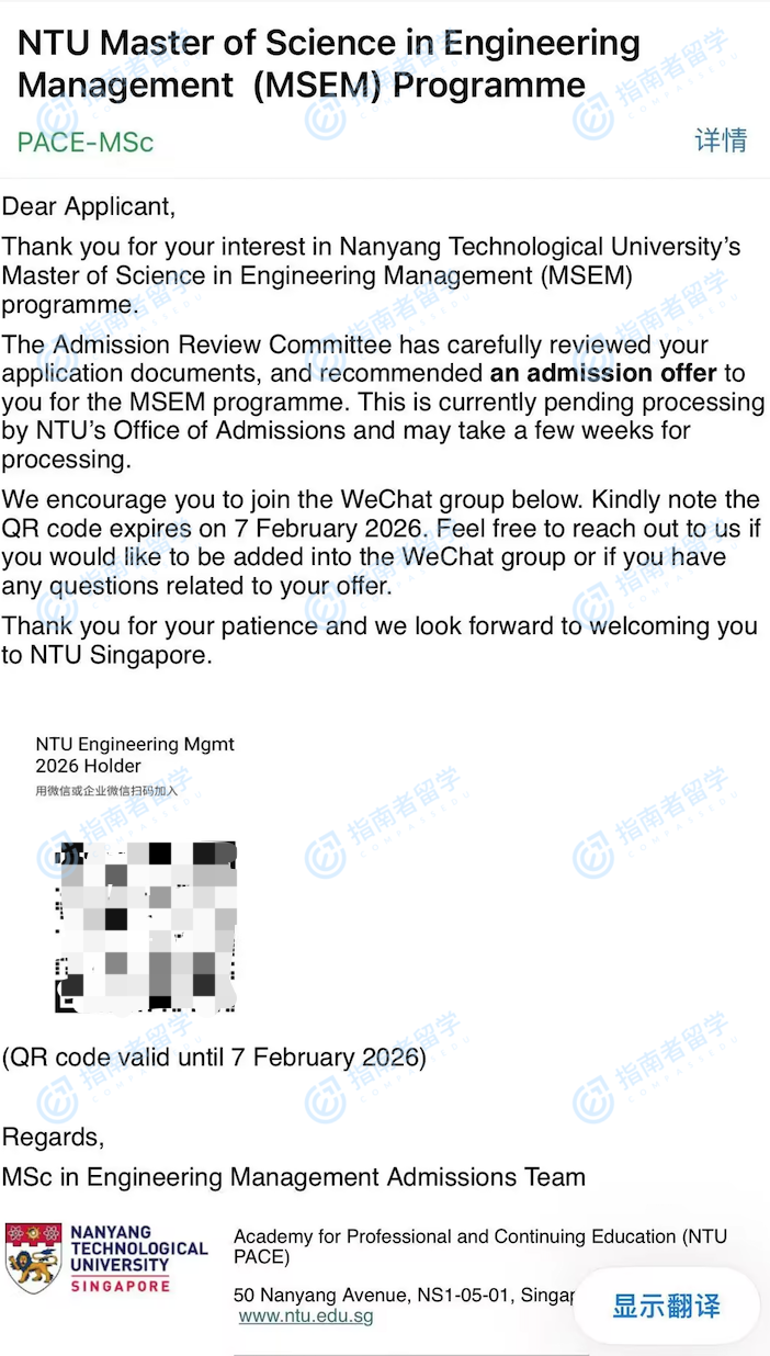 南洋理工大學(xué)工程管理理學(xué)碩士研究生offer一枚