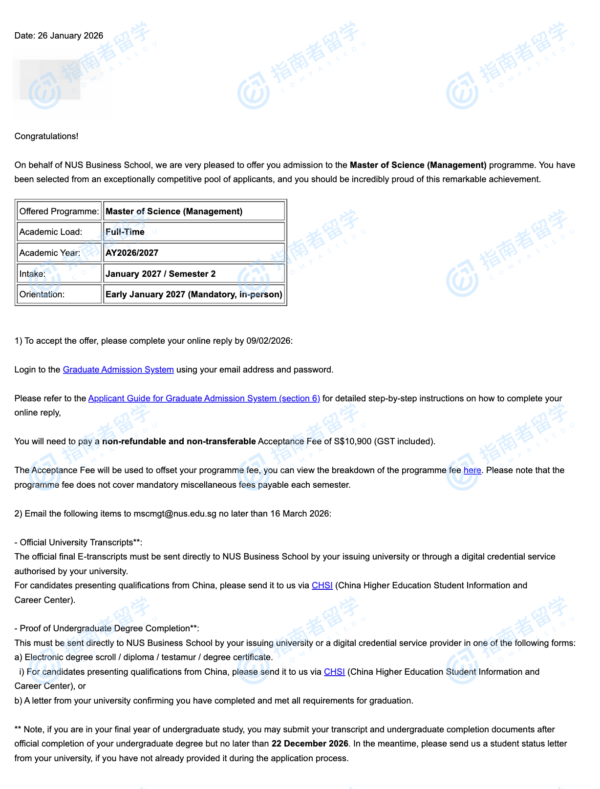新加坡國立大學管理學理學碩士研究生offer一枚