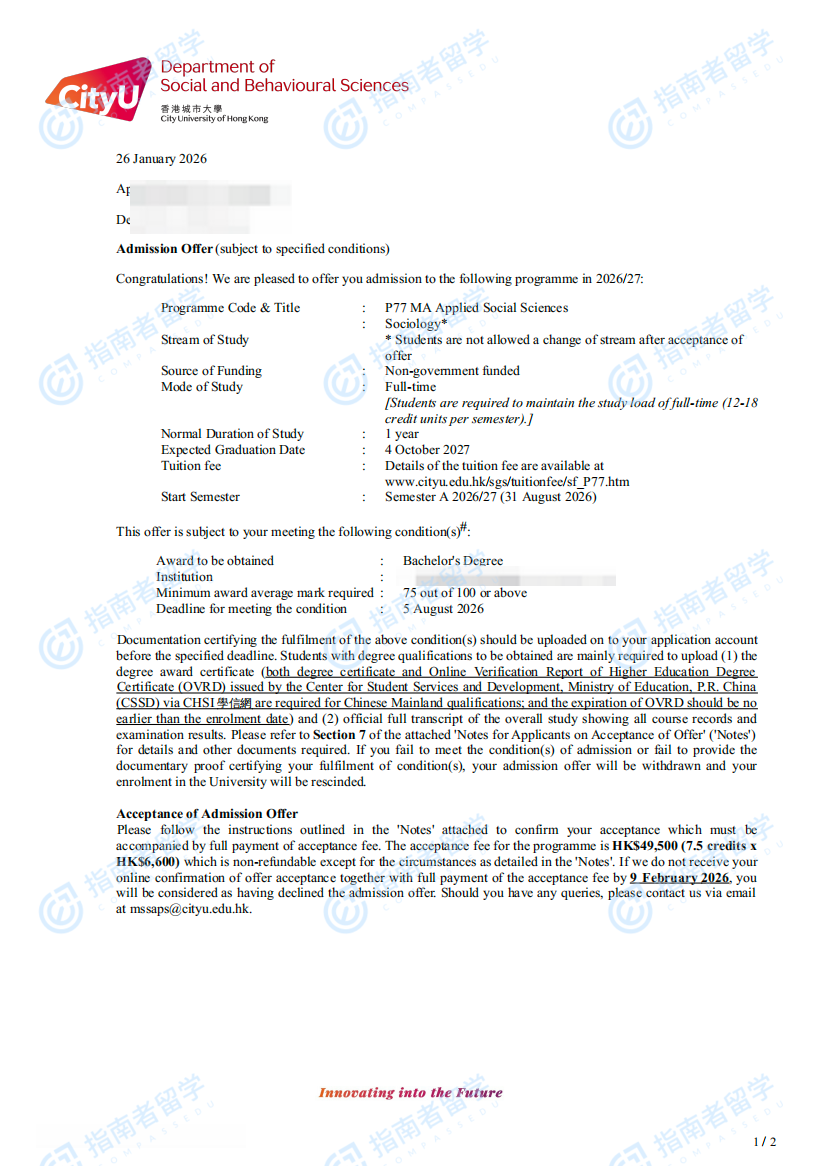 香港城市大學(xué)應(yīng)用社會科學(xué)文學(xué)碩士研究生offer一枚