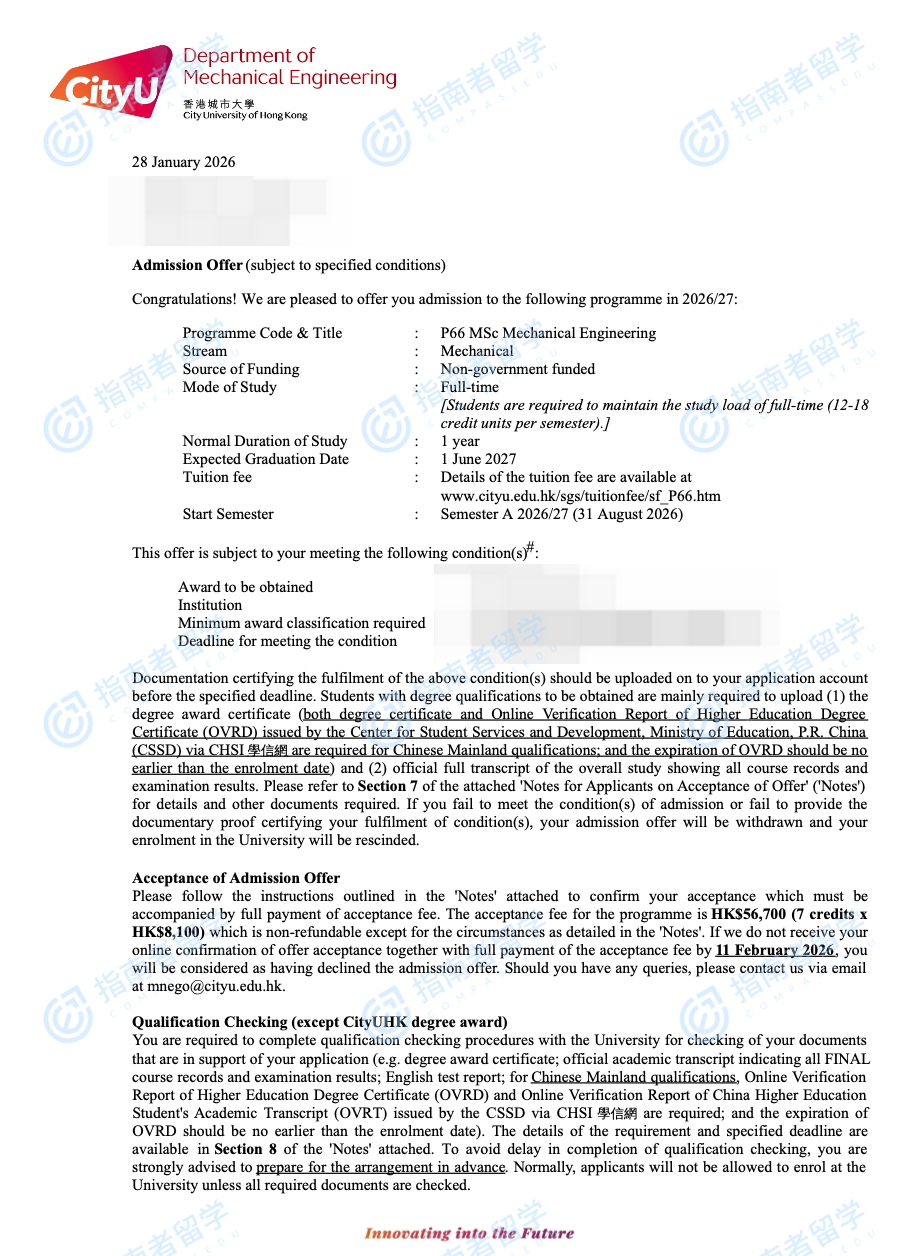香港城市大學(xué)機(jī)械工程學(xué)理學(xué)碩士研究生offer一枚