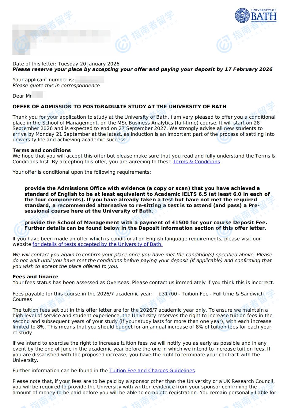 巴斯大學(xué)商業(yè)分析理學(xué)碩士研究生offer一枚