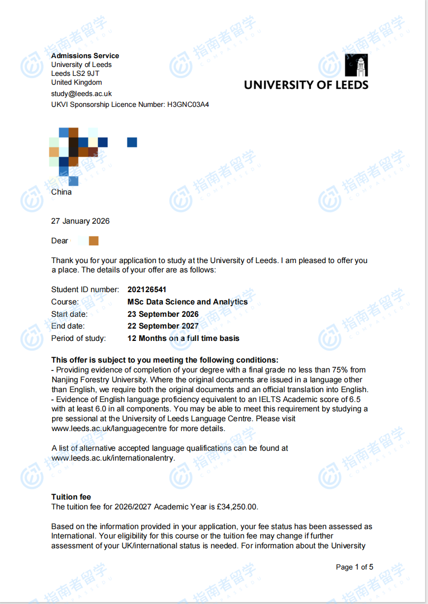利茲大學(xué)數(shù)據(jù)科學(xué)與分析理學(xué)碩士研究生offer一枚