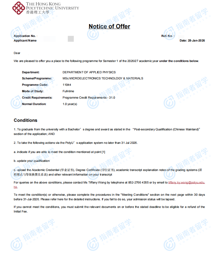 香港理工大學(xué)微電子技術(shù)與材料理學(xué)碩士研究生offer一枚