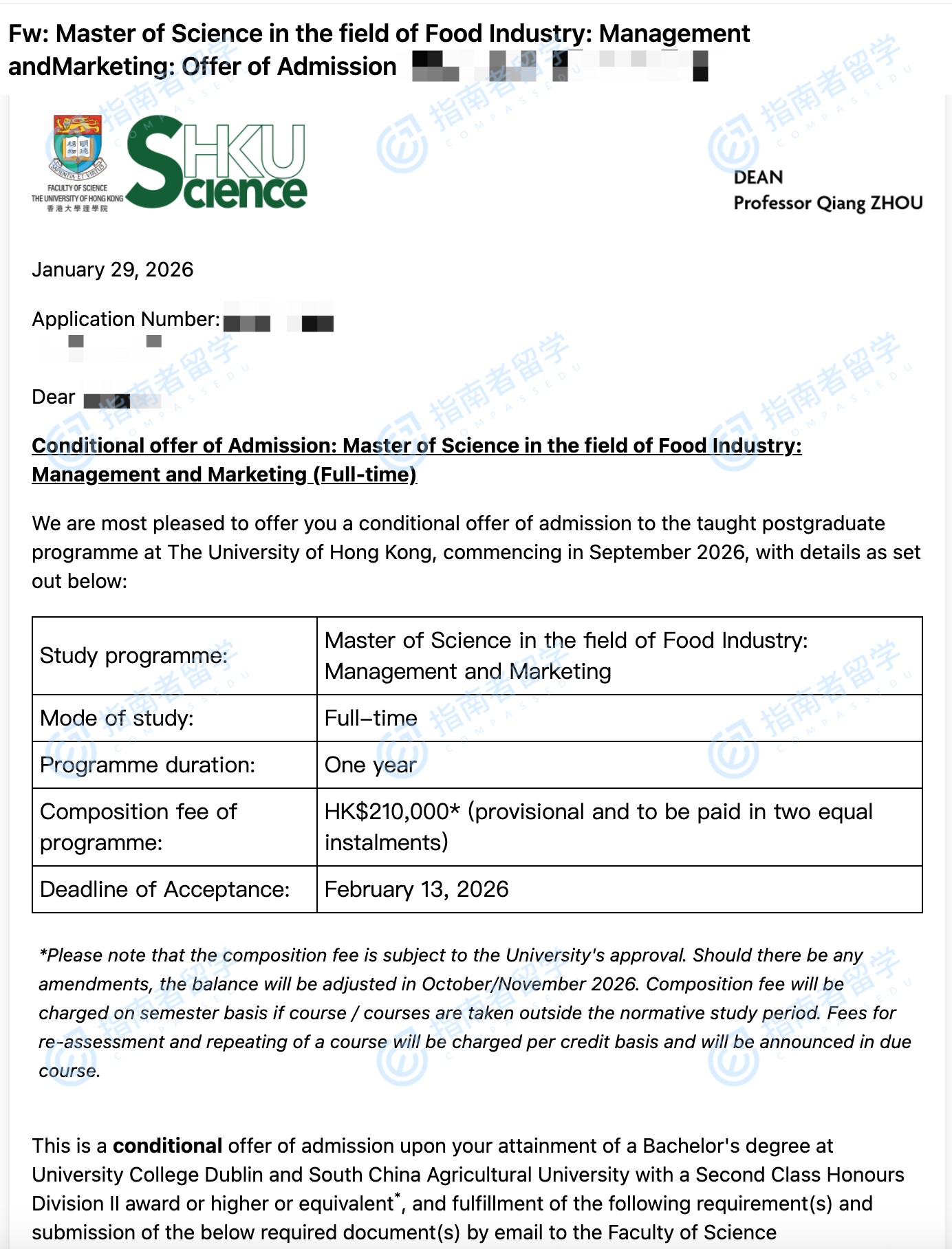 香港大學(xué)食品工業(yè):管理與市場(chǎng)營(yíng)銷(xiāo)理學(xué)碩士研究生offer一枚