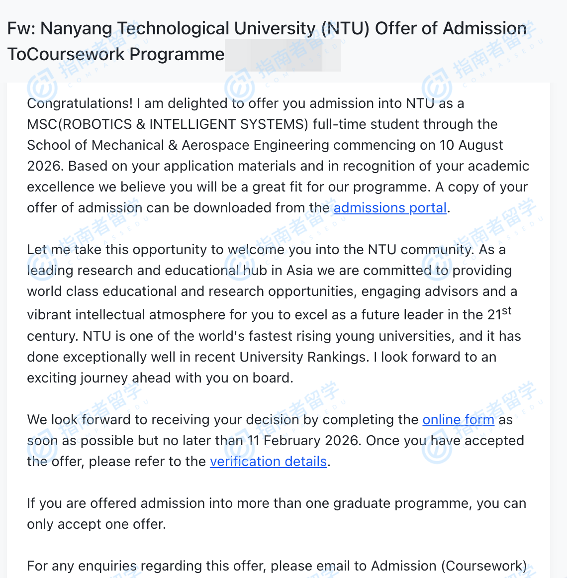 南洋理工大學機器人與智能系統(tǒng)理學碩士研究生offer一枚